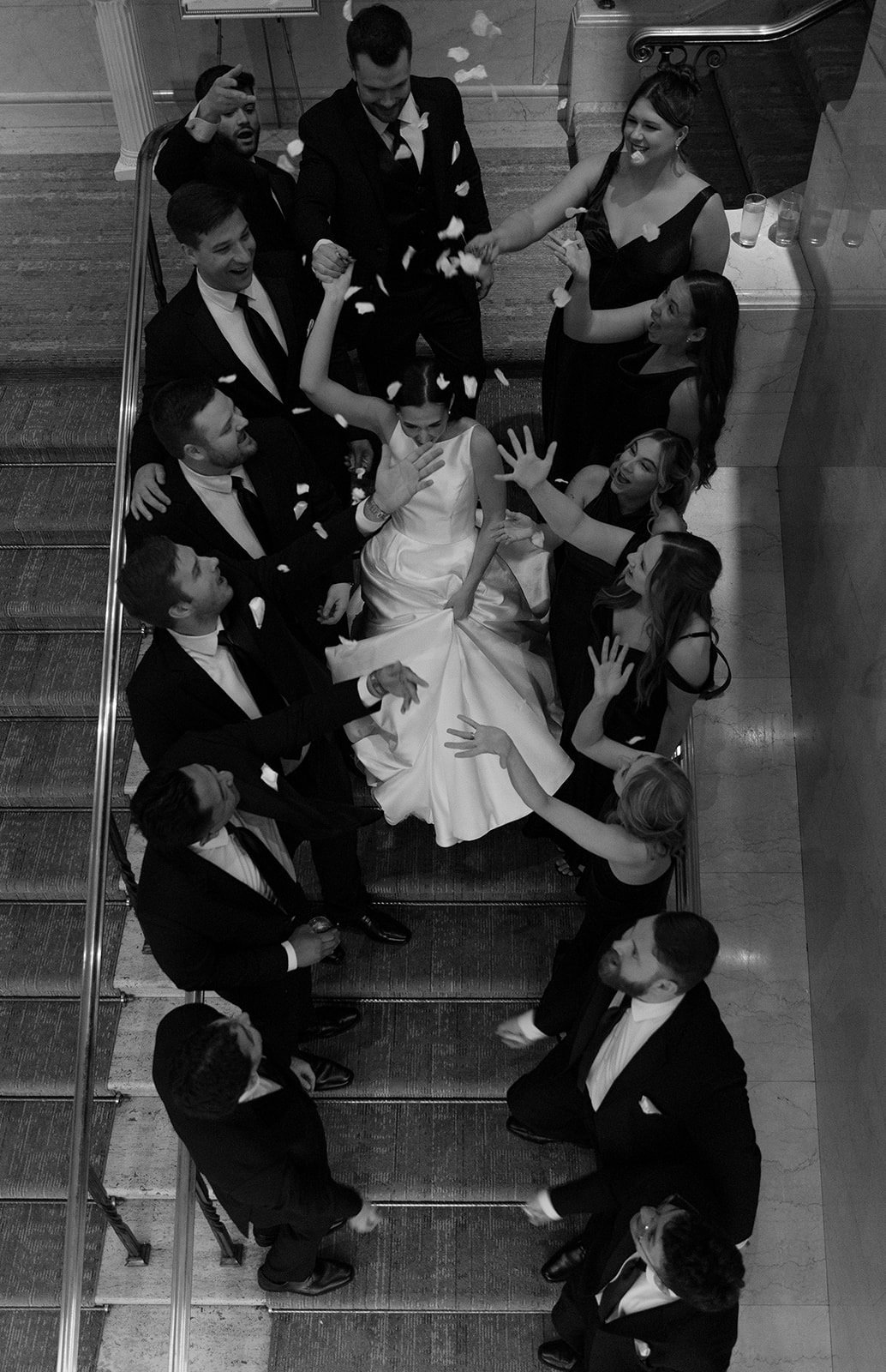 The celebration truly came alive during the grand staircase photos with the wedding party. Sydney and Nathan were surrounded by friends showering them with flower petals—laughter echoing, glasses clinking. It was a burst of pure joy and a perfect representation of the night to come. Their dance floor was packed from the first song, and one could feel the love and energy filling the ballroom with every beat. But amidst all the fun, what struck me most was how present Sydney and Nathan remained—never rushing, always savoring. As a wedding coordinator, it’s always an honor to guide couples through one of the most meaningful days of their lives. But Sydney and Nathan reminded me that the best weddings aren’t just about perfect timelines or Pinterest-worthy details—they’re about heart. And this day had so much of it.